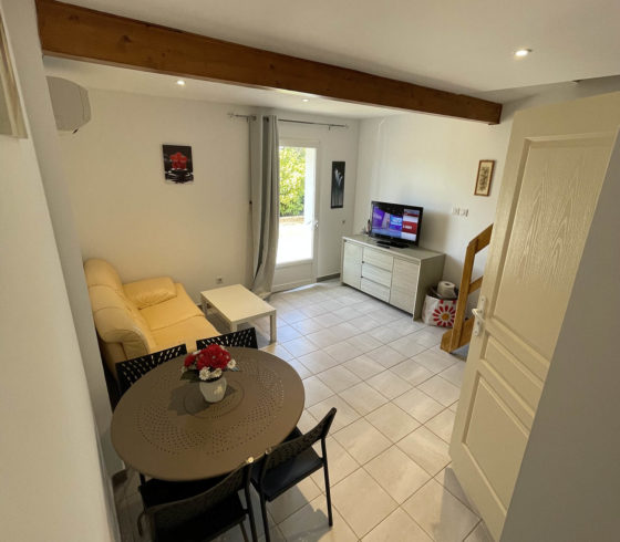 dans la villa "MEZZA", Rez de jardin Duplex 40 m2 , 4 personnes 1 chambre au rez de Chaussée, lit double 160 1 chambre a l’étage (mezzanine) 2 lits de 90, rapprochables Cuisine équipée, lave vaisselle, frigo congel, micro onde, cafetiere ... Salle de douche, WC, lave linge acces au jardin, piscine partagée, terrasse barbecue, parking privé, 2 à 3 vehicules
